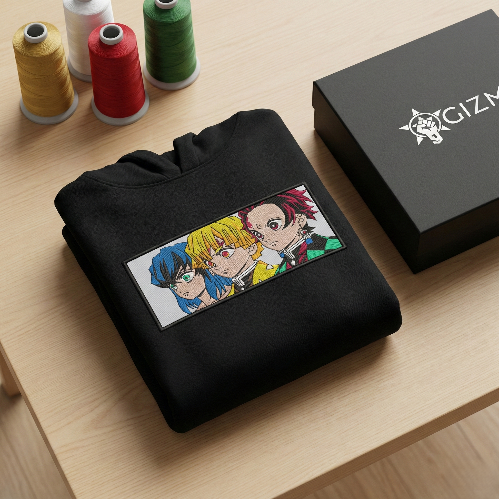 This premium black hoodie features a fully embroidered Demon Slayer Trio panel, stitched with high-precision computerized embroidery. The rich colours and textured finish make the artwork feel like a frame straight out of the anime.